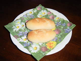 | <作り方> 生地作り @ 適当な容器に水、レモン汁、モルトシロップを入れ、よく溶かしておく。 A ボールに粉、ドライイースト、塩を入れ、軽く混ぜ合わせ、@を入れる。 B 粉っぽさが消えるまで木べらで少しボールに押しつけるようにして混ぜる。ボールの中央に生地を集めていくようにするといいみたいです。 C 生地に粘りが出てきたら、いったん生地をまとめ、そのままボールの中で5分ほどこねる。 (手のひらの付け根あたりを使って生地をボールにこすりつけながらこねる。手に体重をかけるといいみたいです) ※ボールの中でこねるのがやりにくい人は、台の上などで行ってください。私は極力汚したくないのでそのままこねてます。 D 100回たたきつける。 (生地の真ん中を持って台にたたきつると生地が台にくっつくので、そのまま手前に引っ張って半分に折る。折ったあと、生地の向きを90度変える) ※これ以降の作業は、台の上でやった方がいいかも。そんなに台は汚れないし、たたきつけは断然こちらの方がしやすいです。 E 生地ができているかどうかは、生地の端を引っ張ってみて薄い膜のようになればOK。 一次発酵 F できあがった生地をきれいに丸める。生地を両手に持ち、両端から下へ下へと生地を丸め込むようにしながら、表面に張りを持たせるように丸めていく。とじ目を下にしてバター、もしくはオイルを薄く塗ったボールに入れ、ラップをして60分発酵。生地は2倍の大きさになる。 G パンチしてガスを抜く。軽くげんこつを握って生地に入れ、生地の空気を抜く。 ※パンチすることで生地中の気泡が小さくなってきめの細かい生地になる。 H ガスを抜いたら外側から内側に生地をたたむようにひとまとめにしてボールからはがす。台に出し、たたんだ生地を軽く押す。 二次発酵 I たたんだ生地をきれいに丸め直し、オイルを塗ったボールに入れ、ラップをして30分発酵させる。 分割・ベンチタイム・成形 J 発酵した生地をできるだけつぶさないように縁からすくうようにして取り出し、切り分ける。1個約85gで6個に分割する。カードを使って分割しながら生地を1個ずつ丸める。丸め方は表面に張りを持たせるためにまず台の上で二つに折り、そのまま生地を手のひらで包み込んで円を描くように回転させ、きれいな丸い形に整える。 K ラップをかけて20分間生地を休ませる。 ※分割すると生地が傷むために、傷んだ生地を休ませて回復させることをベンチタイムという。同時に丸めるときについた弾力もゆるませる。 L 生地を手のひらで軽く押してガスを抜き、とじ目を上にして奥と手前から1/3ずつ折る。更に半分におり、合わせ目をしっかりと押さえて閉じる。両端が細くなるように転がして形を整える。 最終発酵 M ラップをかけて30分間発酵させる。焼く直前によく切れるナイフで表面に斜めに切れ込みを入れる。 焼き上げ N 天板に乗せた生地の表面がびしょびしょになるくらい霧をふき、オーブンの庫内にもたっぷり霧をふく。220度のオーブンで約20分焼くと、香ばしいフランスパンのできあがり(*^^*) |